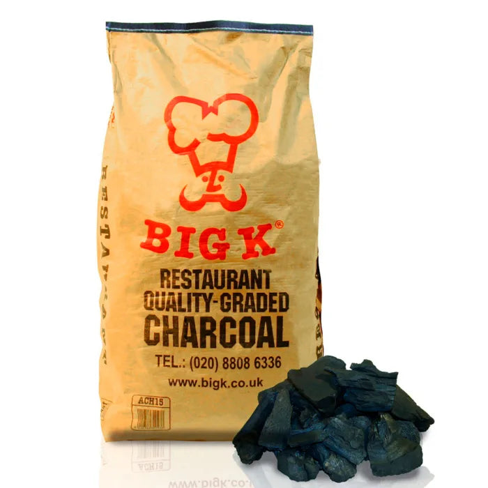 Big K Bag Restaurant Grade Charcoal (Brown) (not for resale) 1x15kg. Black, amorphous solid. Charcoal is the residue of solid, untreated wood, produced during carbonization under exclusion of air and a minimum temperature of 300 degrees Celsius. The proportion of elemental carbon is normally >= 75% with low concentrations of other elements including O, H and N.