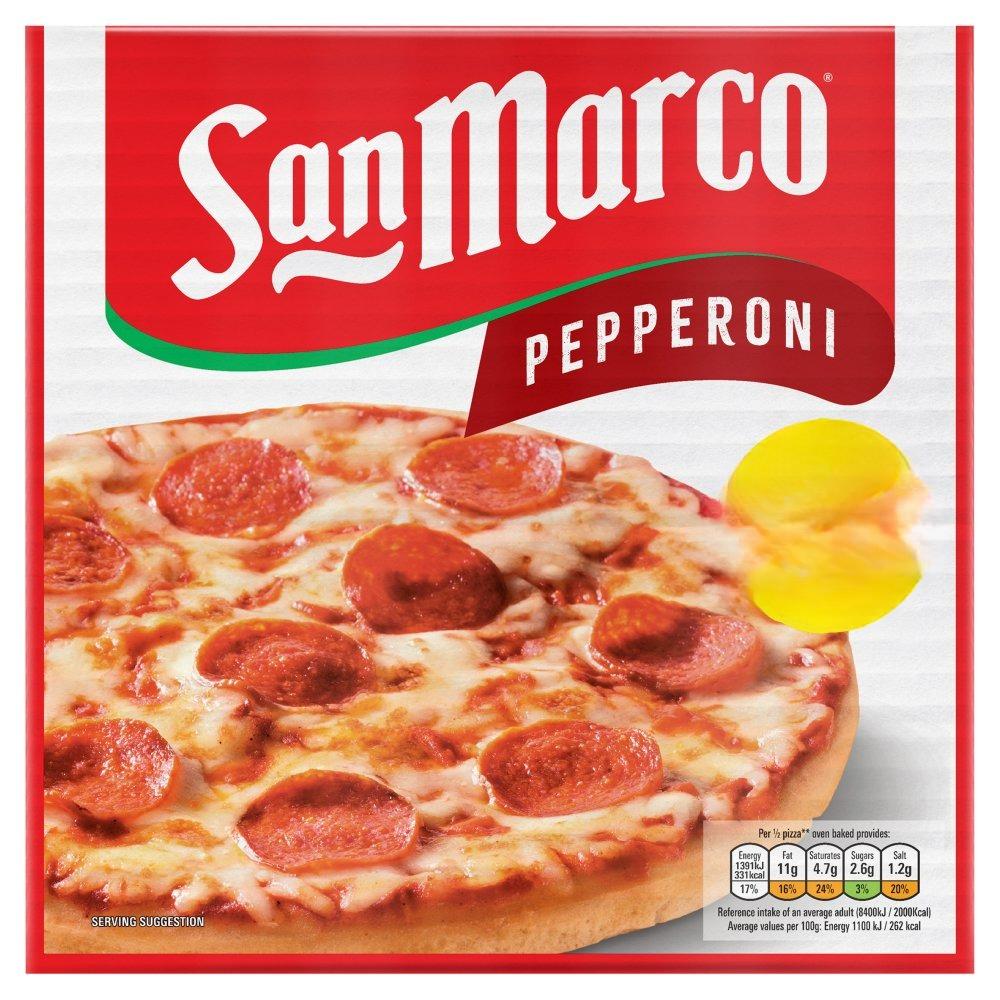 Wheat Flour, Water, Mozzarella Cheese (Milk) (9%), Smoked Pepperoni (7%) (Pork, Pork Fat, Salt, Dextrose, Antioxidants: Sodium Ascorbate, Ascorbic Acid, Extracts of Rosemary; Smoked Salt (Salt, Smoked Salt), Paprika Extract, White Pepper Extract, Preservative: Sodium Nitrite; Chilli Extract), Cheese Style Topping (Milk) (6%) (Water, Palm Oil, Potato Starch, Milk Proteins, Salt, Emulsifying Salts: Calcium Phosphates, Sodium Phosphates; Colour: Beta Carotene), Tomato Paste, Cornflour, Yeast, Dextrose, Salt, Rapeseed Oil, Basil, Sugar, Garlic Purée, Cheese Powder (Milk), Black Pepper, Flour Treatment Agent: Ascorbic Acid