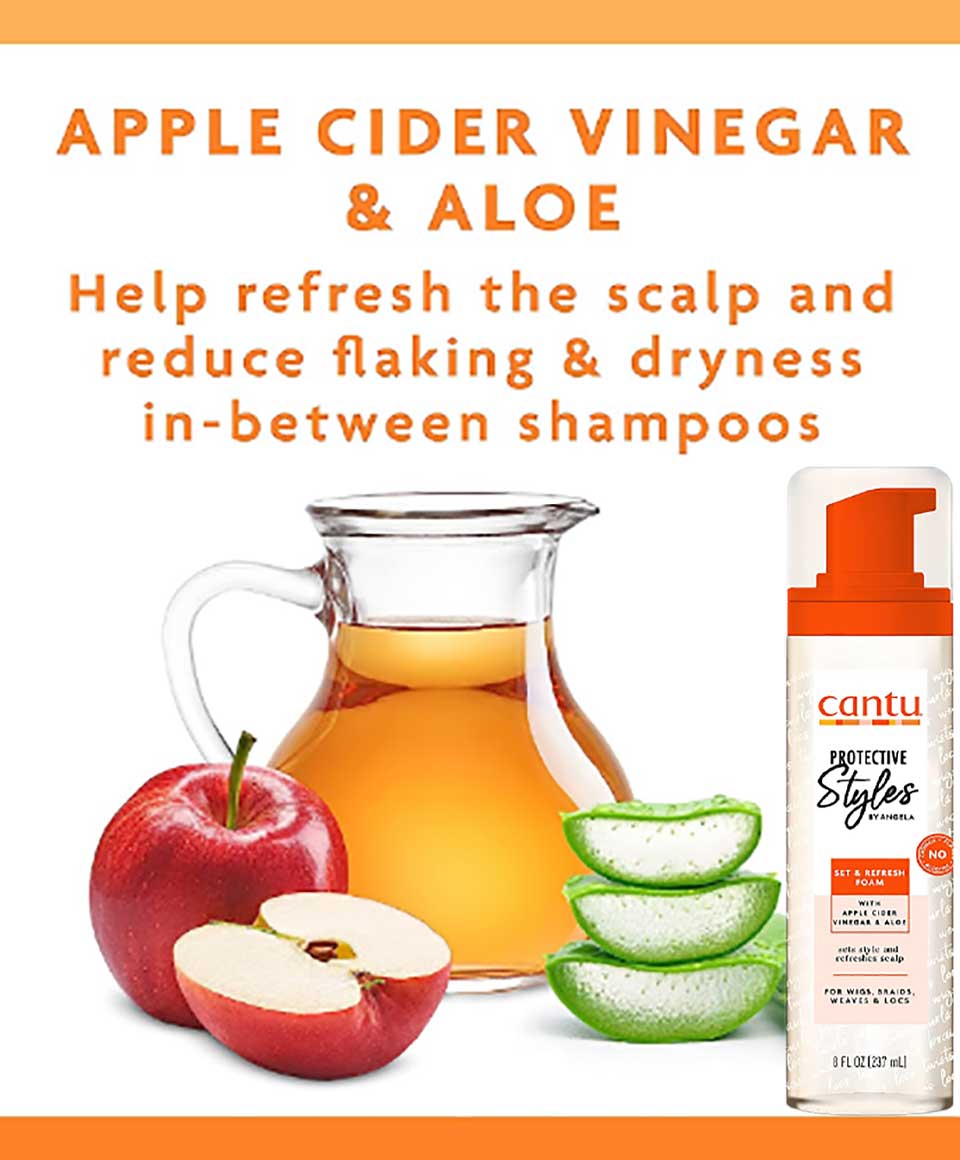 Set your style with the Cantu Protective Styles Set and Refresh Foam. The formula can be used on natural hair or extensions to set braided styles and wigs refresh braids and curly hair extensions, and smooth edges, all without leaving a crunchy residue. The medium-hold foam is enriched with apple cider vinegar to help cleanse and refresh the scalp, while replenishing moisture between washes.