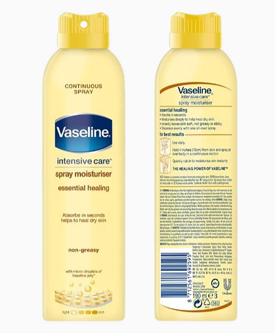 Vaseline essential healing spray moisturiser absorbs in seconds to help heal dry skin. For best results use daily. Hold 10cm from skin and spray all over body in one, continuous motion.