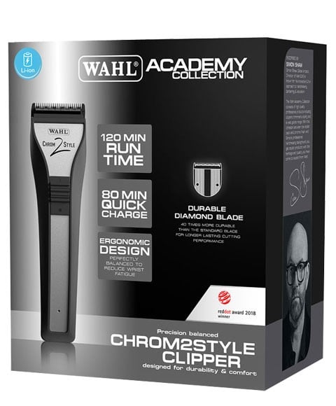 The Wahl Chrom2Style clipper is the second generation of their popular Academy ChromStyle clipper. It features an all-new and award-winning design, improved power pack and a diamond blade as standard. The Chrom2Style won a Red Dot Award in 2018, cited for its great ergonomics that reduce wrist fatigue for all-day cutting. Comfort is coupled to great looks too with its modern angular design. The updated power pack features a lithium ion battery that'll give 120 mins of run time from just an 80-min charge. This drives the powerful chip-controlled motor with a 5300 rpm cutting speed that's ideal for bulk hair removal as well as tapering. The Chrom2Style comes fitted with Wahl's Diamond Blade, which is carbon coated to last up to 40x longer than standard steel and has a 5-position, variable cutting length (0.7, 1.2, 1.8, 2.4 & 3.0 mm). Its snap-on/off design makes it easy to replace and you can also use any of the blades designed to fit the original ChromStyle. The Wahl Chrom2Style is supplied with 8 attachment combs (1.5, 2, 3, 6, 9, 12, 19 & 25 mm), charger and charging stand and a cleaning brush and oil.