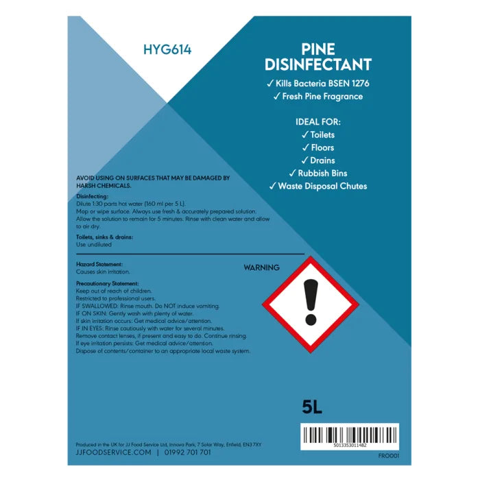 Professional-grade, fresh, pine scented disinfectant. Ideal for toilets, floors, drains, rubbish bins and waste disposal chutes. For disinfecting purposes, simply dilute with water as per the label instructions and use as required. Alternatively, use undiluted to clean toilets, sinks and drains. For use in catering environments, industrial cleaning and households.