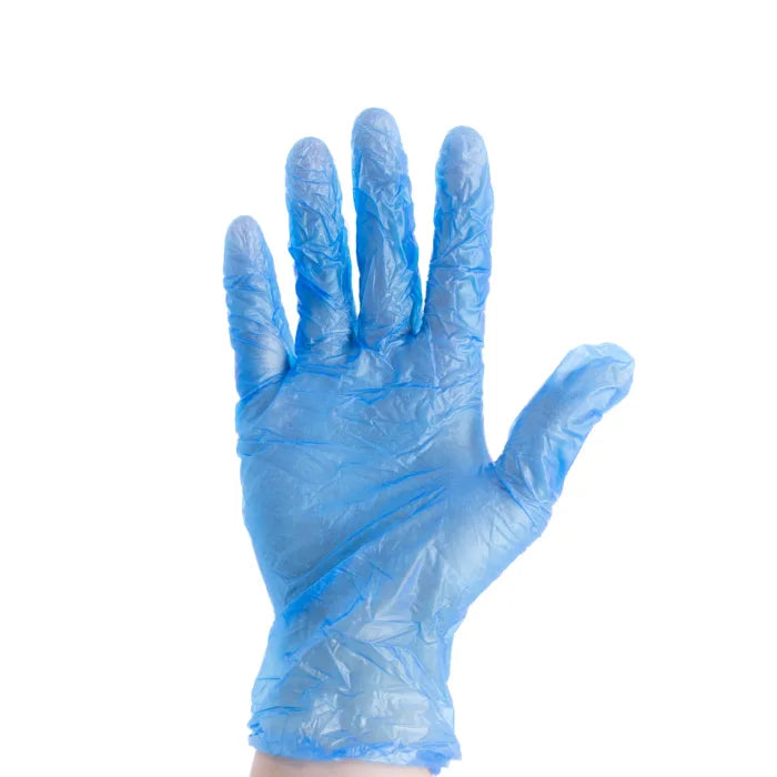 Disposable vinyl gloves, safe for use in kitchen and catering environments, and light duty cleaning. Soft and durable, our blue gloves keep hands clean and free from contaminants, and are ideal for medium-sized hands. Powder free