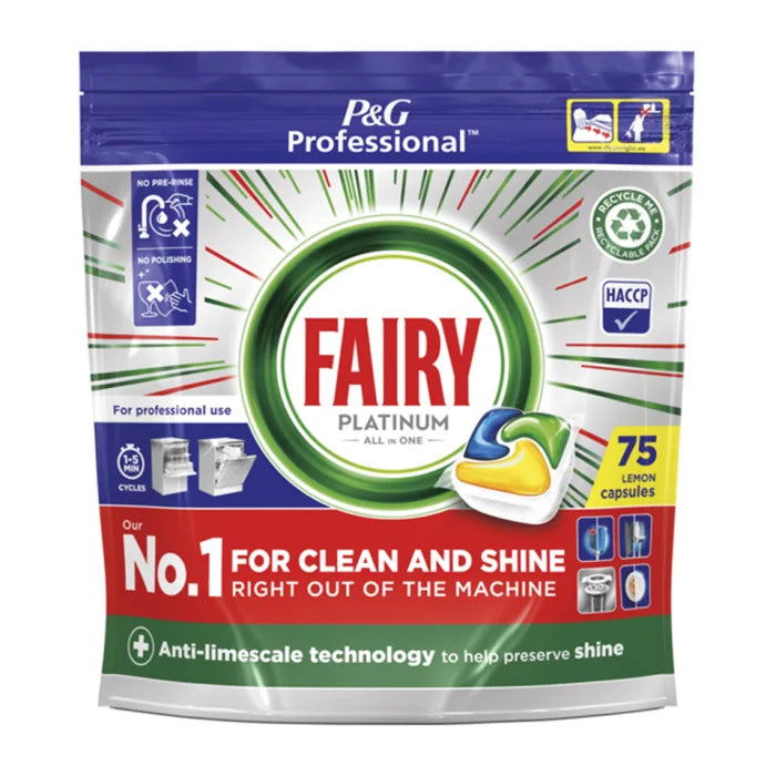 Fairy Professional Auto Dishwasher Capsules Lemon 1x75's deliver a burst of citrus freshness to your dishwashing routine. With convenient pre-measured capsules, these deliver powerful cleaning, leaving your dishes spotless. Enjoy the zesty aroma and effortless brilliance in every wash with Fairy Lemon Capsules.