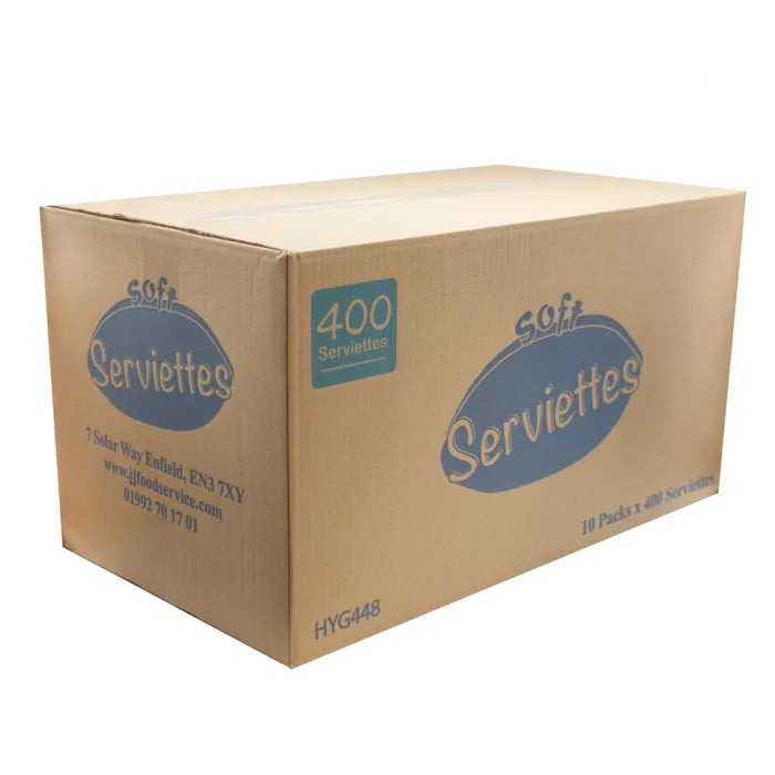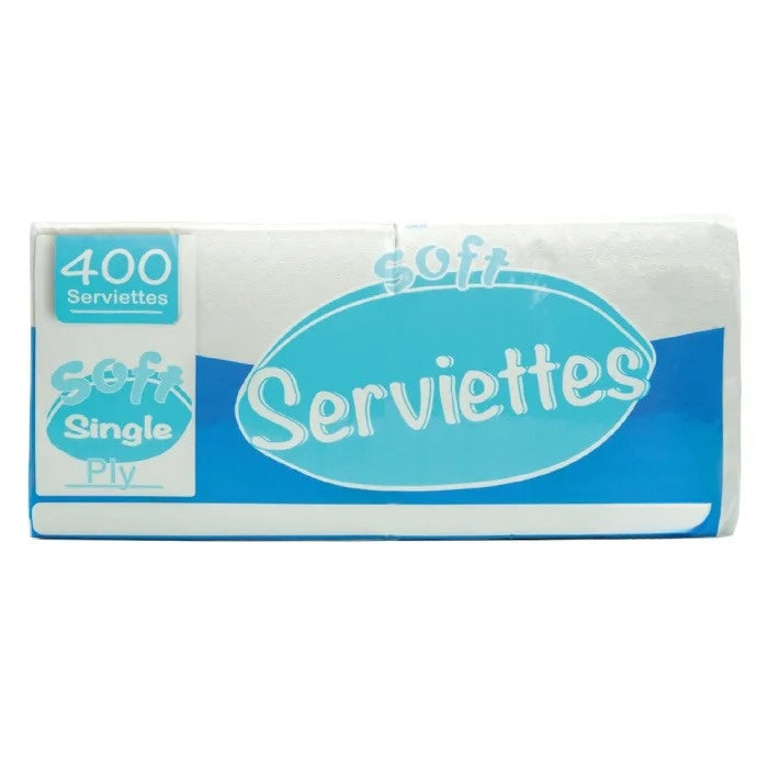Single ply soft serviettes ideal for restaurants and catering. 400 serviettes per pack. 10 packs per box.