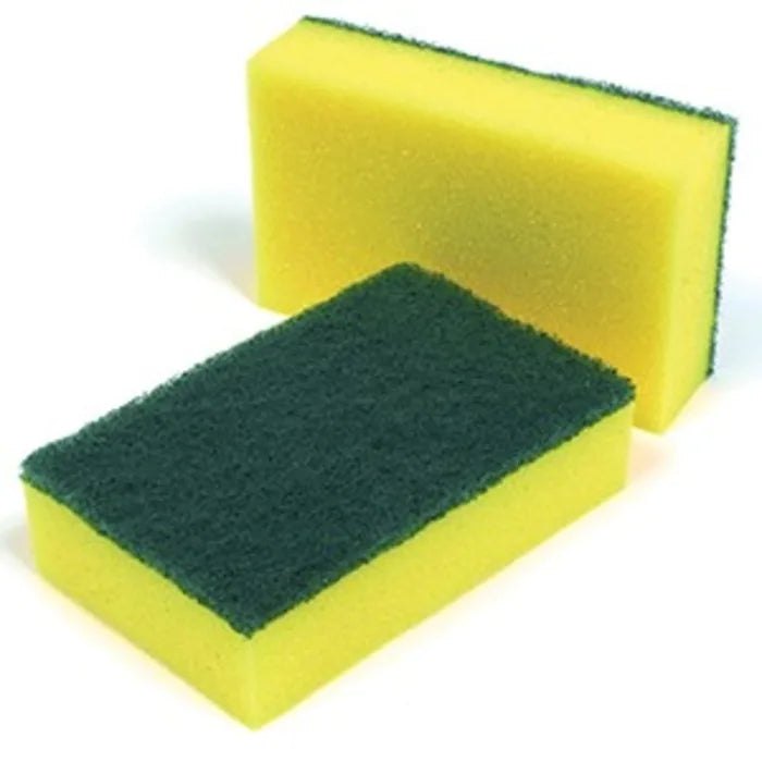 Soft, absorbent sponge with a scouring pad on one side to remove stubborn grime from dishes and surfaces.