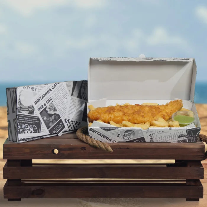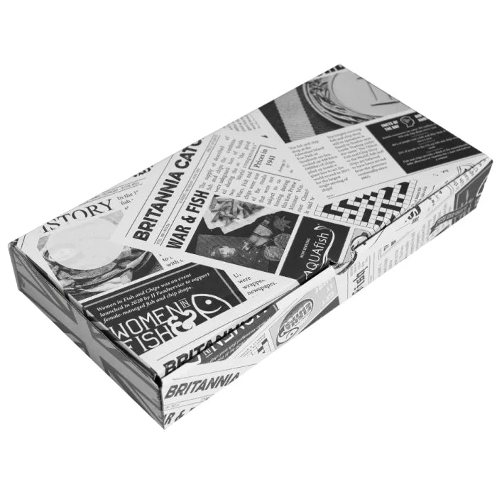 Retro, newspaper print, cardboard fish and chip box. Ideal for larger portions. 100% recyclable, biodegradable and compostable. Keeps food hot and crispy.