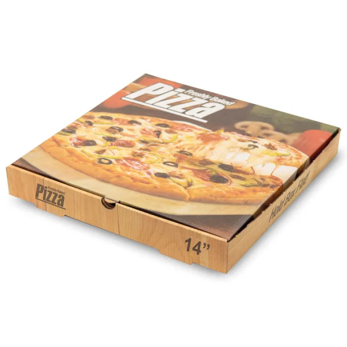 Cardboard pizza boxes, with full colour print. Easy to assemble, these corrugated cardboard boxes provide a safe solution to transport pizzas, while keeping food hot. Recyclable and biodegradable.