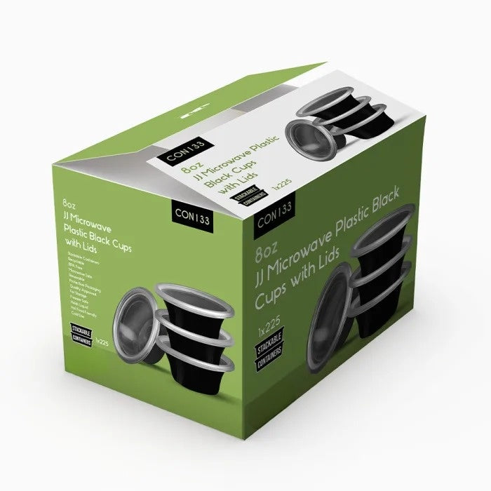 Black, round plastic cups with lids, made from premium quality plastic. Each container holds up to 8oz of both hot and cold foods and liquids. Safe for use in the microwave and freezer, and can be re-used and recycled. The sturdy, stackable design makes the containers easy to store and transport food. Great for side dishes like baked beans, sauces, soups, yoghurt and much more.