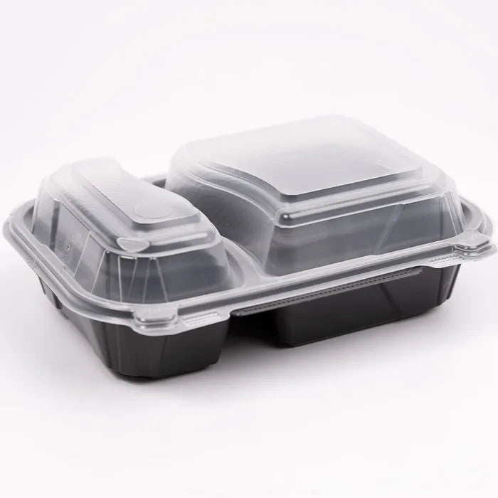 Black, rectangle, two compartment plastic containers with clear domed lids, made from premium quality plastic. Each container holds up to 900ml of both hot and cold foods and liquids. Safe for use in the microwave and freezer, and can be re-used and recycled. The sturdy, stackable design makes the containers easy to store and transport food.