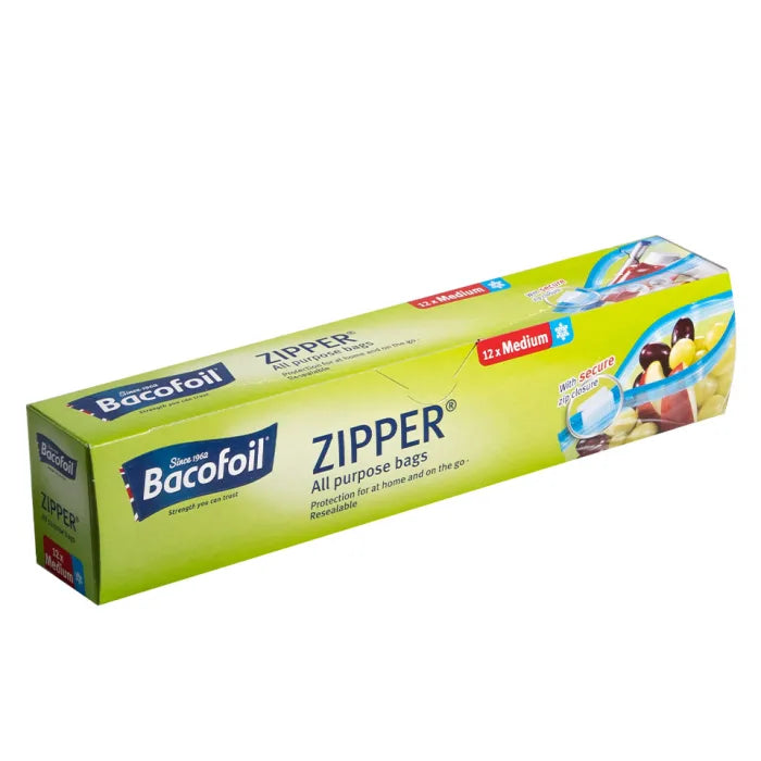 Resealable medium sized bags with a secure zip tight seal. Perfect for storing, keeping fresh, freezing and transporting food.