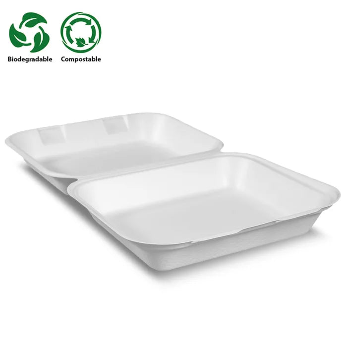 N10/HP10 Large Size White Biodegradable & Compostable Bagasse Food Box. 239mm x 155mm x 69mm
