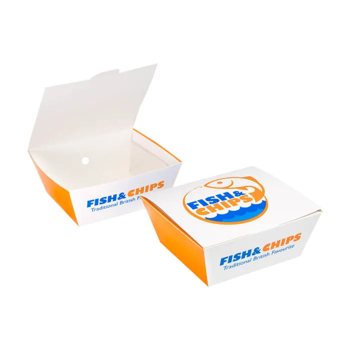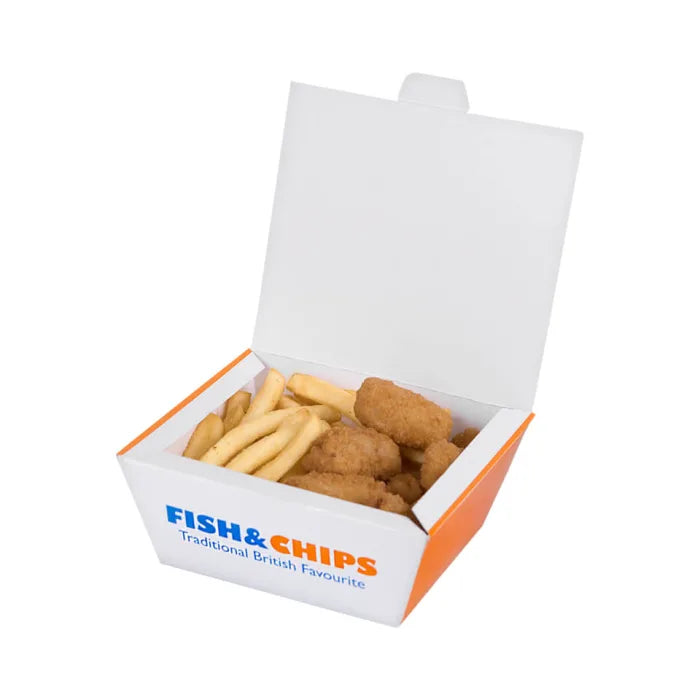 Extra small. thin cardboard box with fish and chip branding. Ideal for kids' portions and side dishes. Helps to assist with portion control and reduce waste.