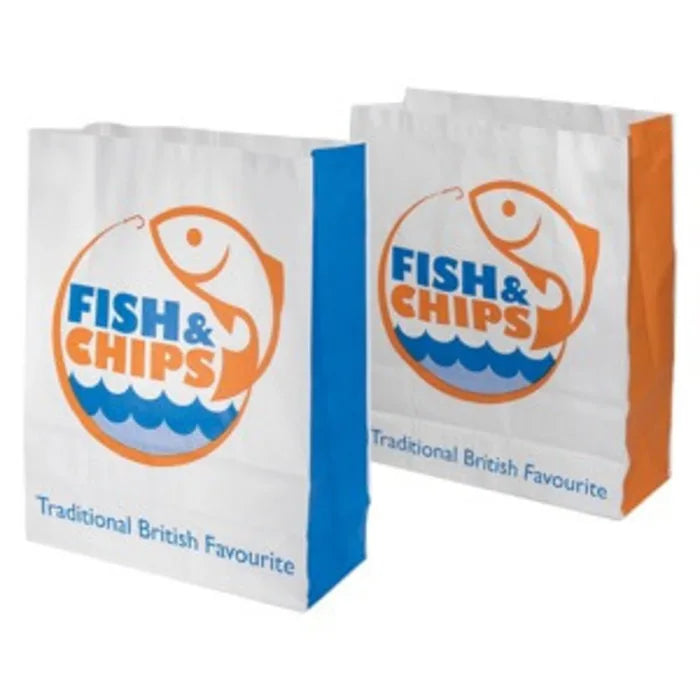 Greaseproof lined paper bags, with fish and chip branding. A high-quality bag for packaging food and keeping it warm in transit.