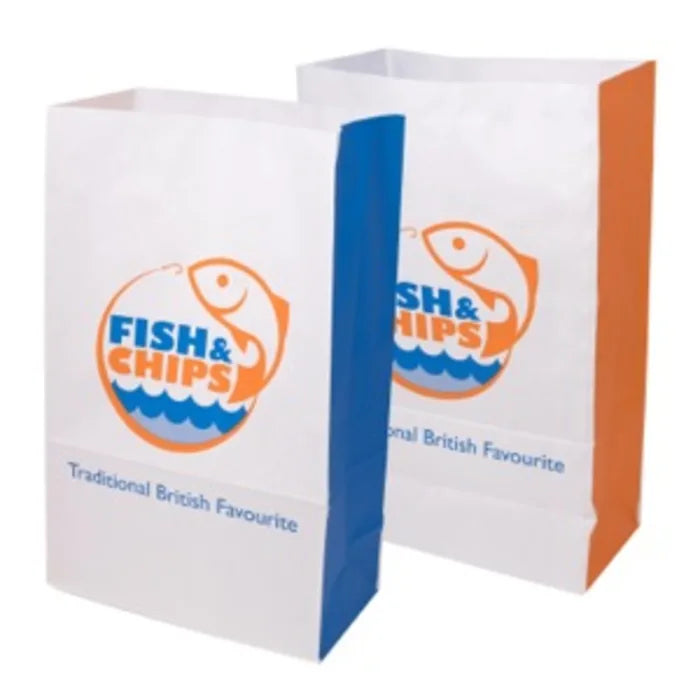 Large, non-handled, paper bags, with fish and chip branding. A high-quality bag for packaging food, making it easier for your customers to take their food away with ease.