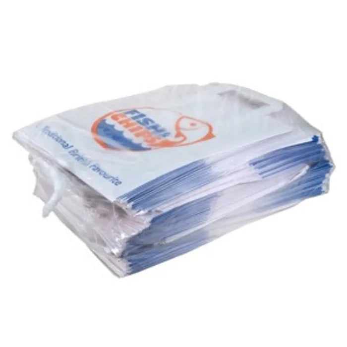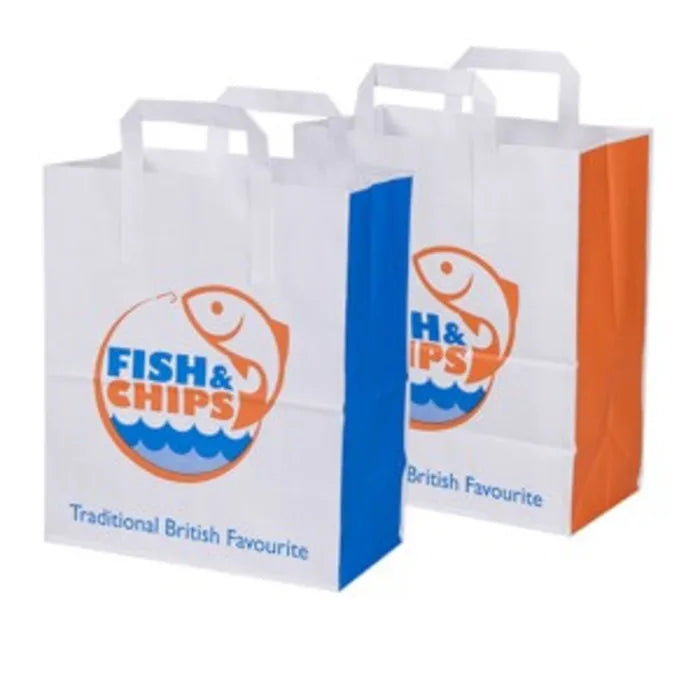 Large paper carrier bags with fish and chip branding. The sturdy carry handles make it easier for your customers to take their food away with ease.