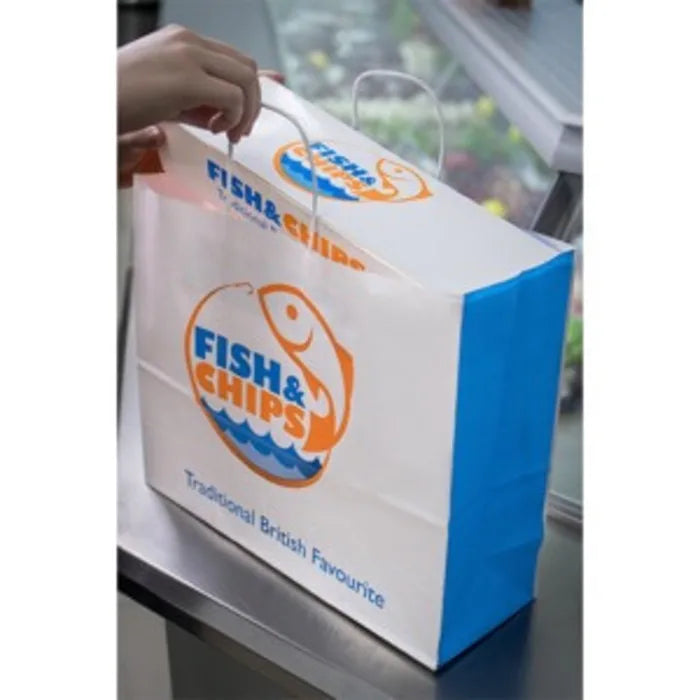 Large paper carrier bag with fish and chip branding. The strong, twisted handles make it easier for your customers to take their food away with ease.