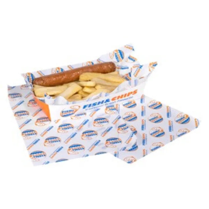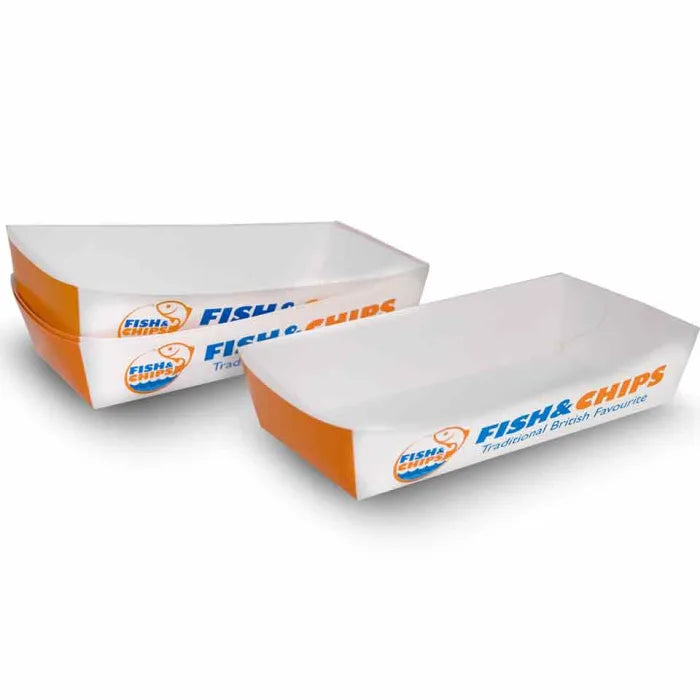 Medium sized, cardboard tray with fish and chip branding. A sturdy, open tray for enjoying fish and chips on the go. Helps to assist with portion control and reduce waste.