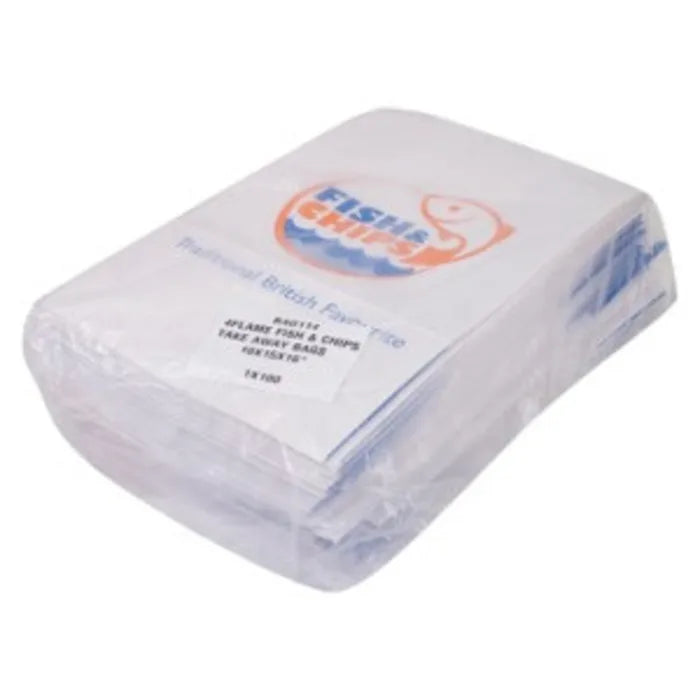 Medium, non-handled, paper bags, with fish and chip branding. A high-quality bag for packaging food and keeping it warm in transit.