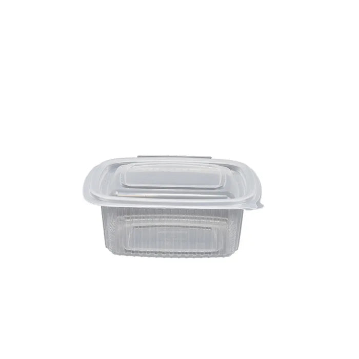Durable, hinged plastic food container, with self-sealing lids. Ensuring safe transportation and storage of solid and liquid foods, ideal for salads, pasta, fruit and cake slices. Holds up to 500ml of hot and cold foods. 300 containers per box.