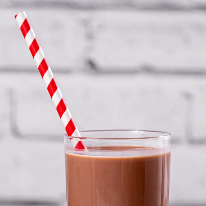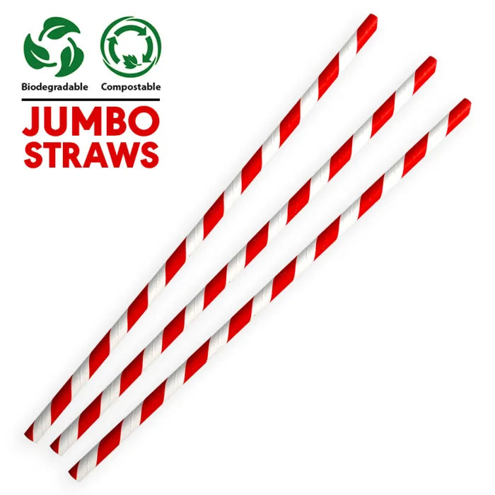 Red and white striped compostable jumbo paper straws. Perfect for smoothies, milkshakes and juices.