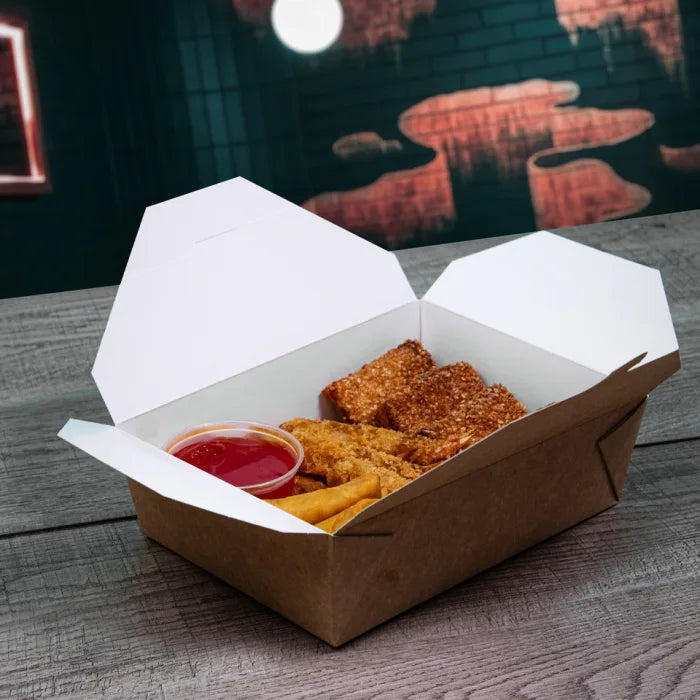 Large, brown kraft food box, ideal for customers to enjoy hot or cold food on-the-go. Strong and leak resistant, with a folding lock lid. A great, sustainable alternative to plastic containers.