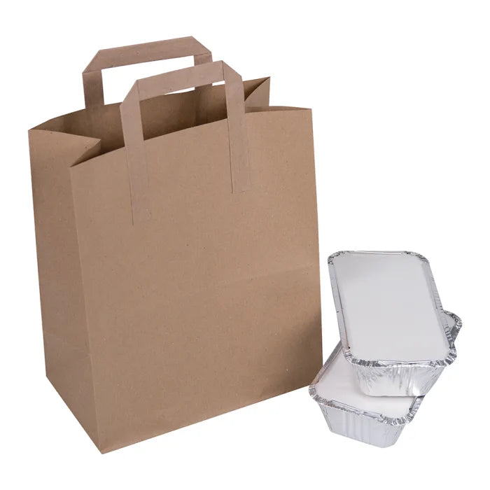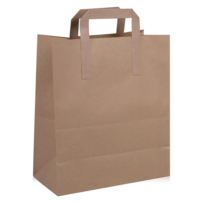 (220x110x280mm) Premium, medium, brown paper carrier bags with flat handles. A great, sustainable alternative to plastic bags. Ideal for customers taking food away, due to their wide base.