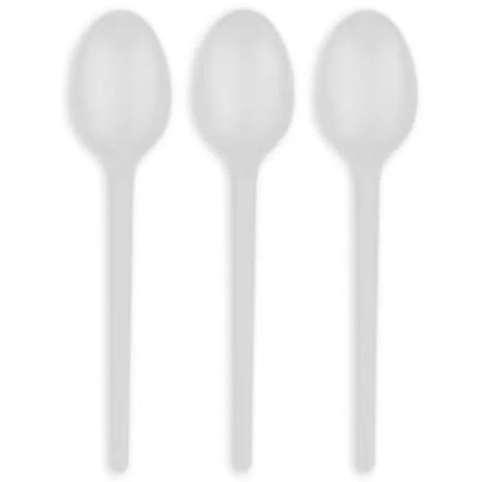 Plastic, white, dessert spoons for catering and food use. Ideal for foodservice and large gatherings including BBQ's, parties, conferences and picnics.