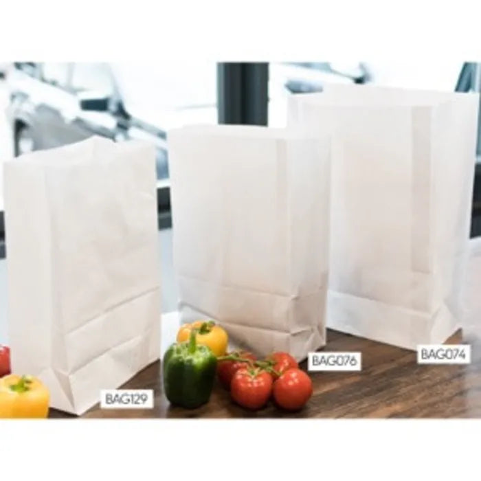 Large, white, paper carrier bags without handles. Un-printed for versatility between businesses. A great, sustainable alternative to plastic bags. Ideal for customers taking food away.