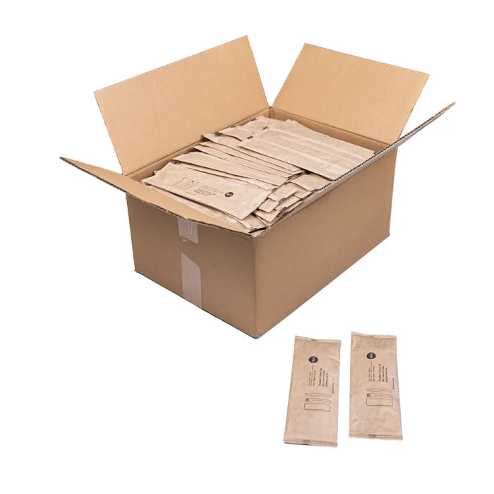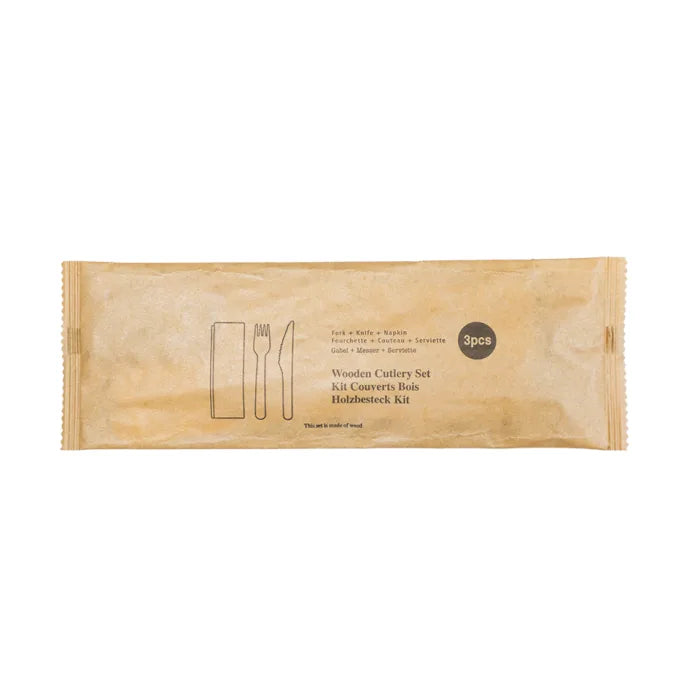 Single use, wooden fork and knife, and a 2ply napkin. Hygenically wrapped in paper to prevent contamination. Ideal for customers to enjoy food on-the-go. Fully recyclable after use.