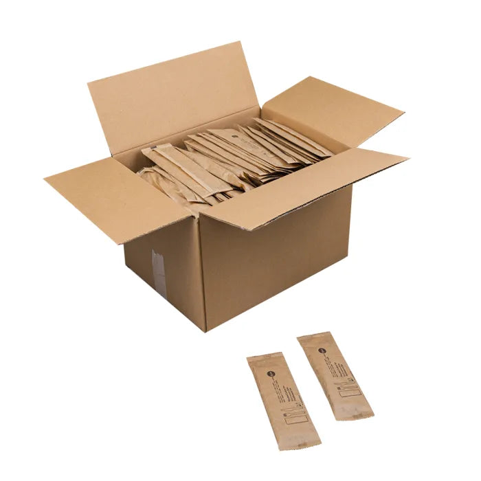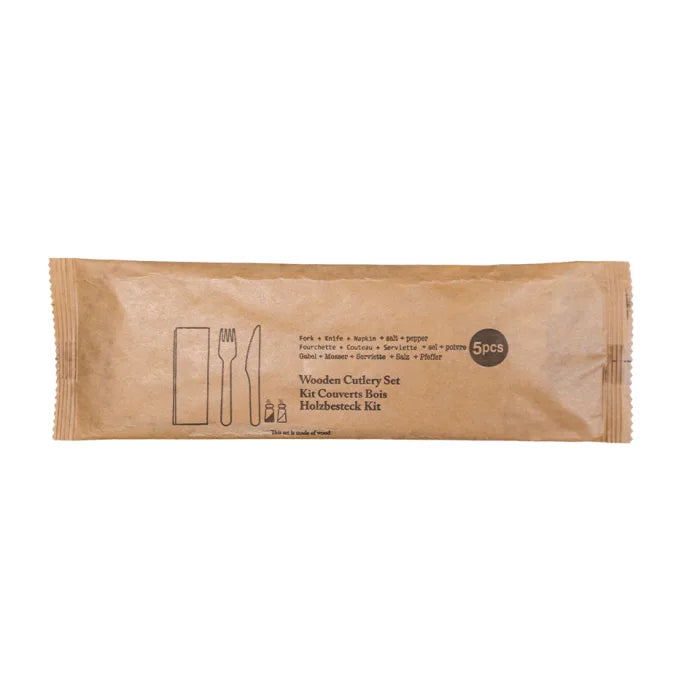 Single use, wooden fork and knife, salt and pepper sachets, and 2ply napkin. Hygenically wrapped in paper to prevent contamination. Ideal for customers to enjoy food on-the-go. Fully recyclable after use.