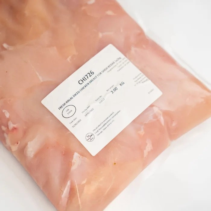 Introducing our Fresh Halal Diced Chicken Breast, perfect for Shish Kebab lovers! Our chicken is carefully selected, skilfully cut, and delivered to your doorstep, ensuring maximum freshness and quality. With a 1x2kg pack, you'll have enough to feed the whole family or impress your guests at your next barbecue. Our chicken is halal-certified, ensuring it meets the highest standards of purity and quality. Marinate it with your favourite spices, skewer it on a stick, and grill it to perfection for a mouth-watering meal that will leave everyone asking for more. Order now and experience the taste of premium halal chicken!