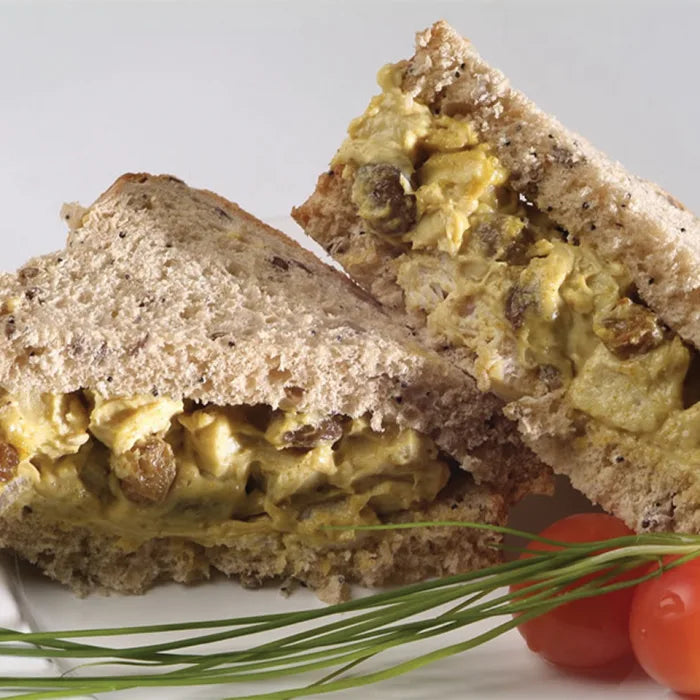 Diced Chicken Fillet (45%) (Chicken Breast Fillet, Salt), Thick & Creamy Mayonnaise (41%) Water, Rapeseed Oil, Sugar, Modified Maize Starch, Salt, Egg Yolk Powder, (Pasteurised Egg Yolk Powder, Salt, Maltodextrin), Stabilisers: Xanthan Gum, Guar Gum, Preservatives: Acetic Acid, Potassium Sorbate., Turkish Sultanas (10%), Curry Glaze (4%) Maltodextrin, Sugar, Spices: Black Pepper, Cayenne, Cinnamon, Clove, Coriander, Cumin, Fennugreek, Ginger, Nutmeg, Turmeric, Salt, Cornflour, Flavour Enhancer; HVP, Salt, Maltodextrin, MSG E621, Onion Powder, Thickener; Modified Starch E1422, Acidulant; Citric Acid E330, Coriander Leaf Oil, Colours: Beta Carotene E160a, Caramel Powder E150c. (Soya).