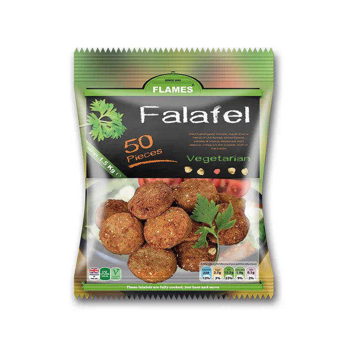 Introducing Flames Falafel - the perfect addition to your menu! Made with high-quality ingredients and packed with flavor, these Falafel bites are a delicious vegan and vegetarian-friendly option. Each 30g Falafel is carefully crafted with chickpeas, herbs, and spices, resulting in a crispy exterior and a soft, flavorful center. Whether served as an appetizer, snack, or a main course, these Falafel bites are sure to satisfy all of your customers' cravings. With 2x50 packs, you can easily and conveniently stock up on this tasty treat. Impress your customers with the bold and authentic taste of Flames Falafel today!